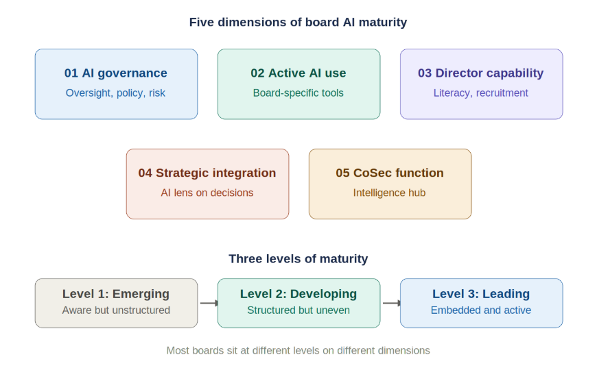 The AI Maturity Framework provides a practical diagnostic for boards and company secretaries to assess where they stand on AI readiness and where to focus next.