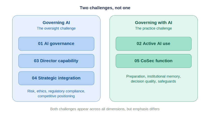 Governing with AI means using AI tools within the boardroom itself. It is about preparation, analysis, institutional memory, and decision quality. It demands that the board agrees on what tools are appropriate, what data they can process, and what safeguards are non-negotiable. This is the practice challenge.